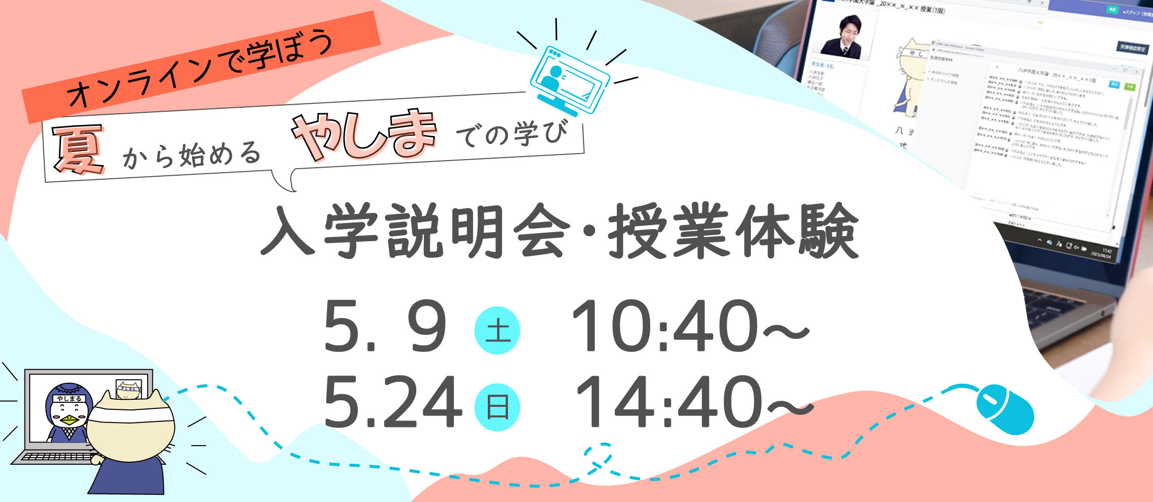 入学検討者の皆さまへ授業配信システムの体験ができる「入学説明会・授業体験(オンライン)」を開催します。「正常に受講できるのか不安」「授業画面を体験してみたい!」という方はご参加ください。