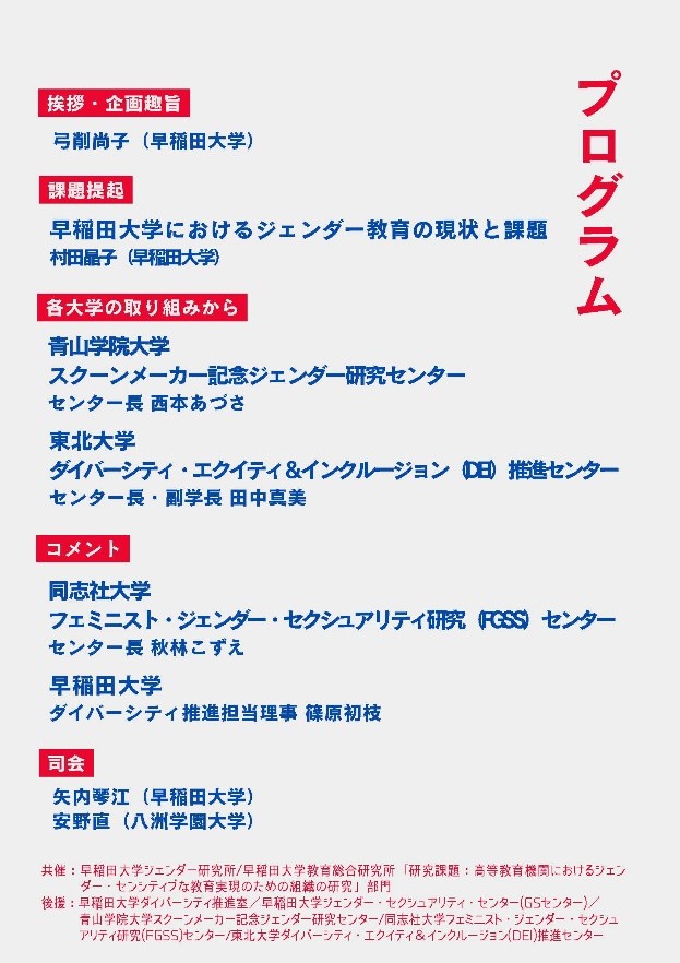 後援:早稲田大学ダイバーシティ推進室/早稲田大学ジェンダー・セクシュアリティ・センター(GSセンター)/青山学院大学スクーンメーカー記念ジェンダー研究センター/同志社大学フェミニスト・ジェンダー・セクシュ アリティ研究(FGSS)センター/東北大学ダイバーシティ・エクイティ&インクルージョン(DEI)推進センター