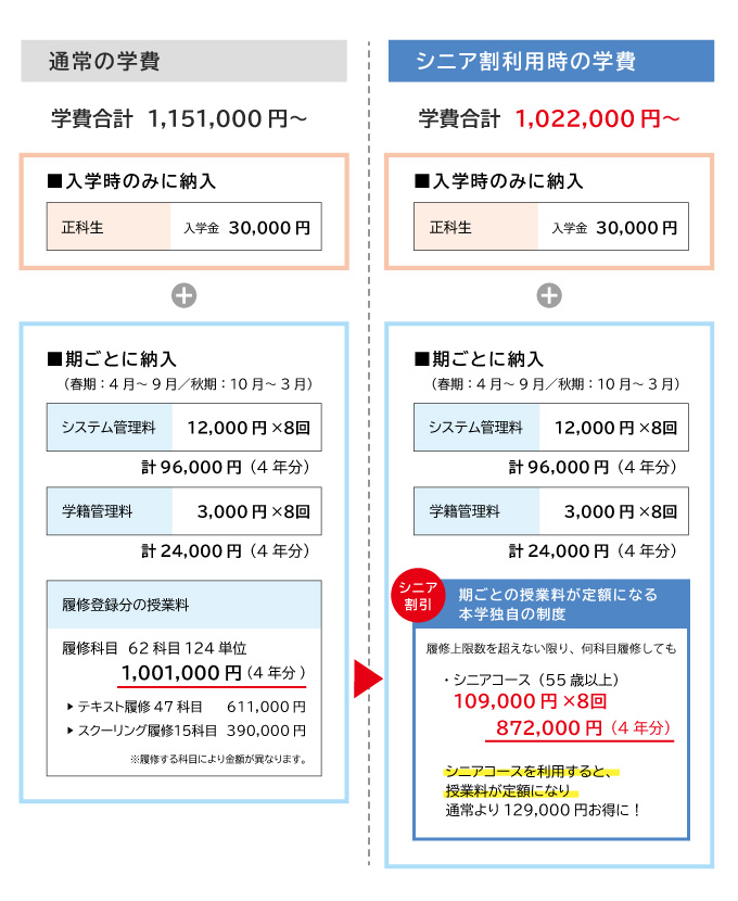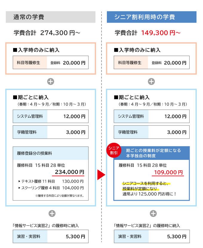 シニア割引の対象は履修した科目分の授業料のみです。それ以外の項目はシニア割引に含まれません。(例:入学金/管理料(システム管理料、学籍管理料)/教科書代/演習・実習費 等)