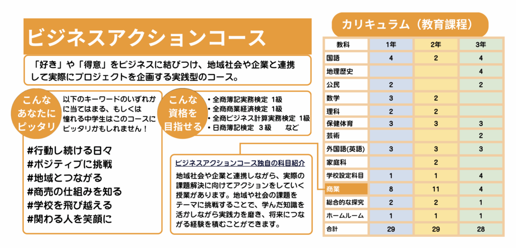 ビジネスアクションコースの特徴は、地域社会や企業と連携しながら、実際の課題解決に向けてアクションをしていく授業があるところです。地域や社会の課題をテーマに挑戦することで、学んだ知識を活かしながら実践力を磨き、将来につながる経験を積むことができます。