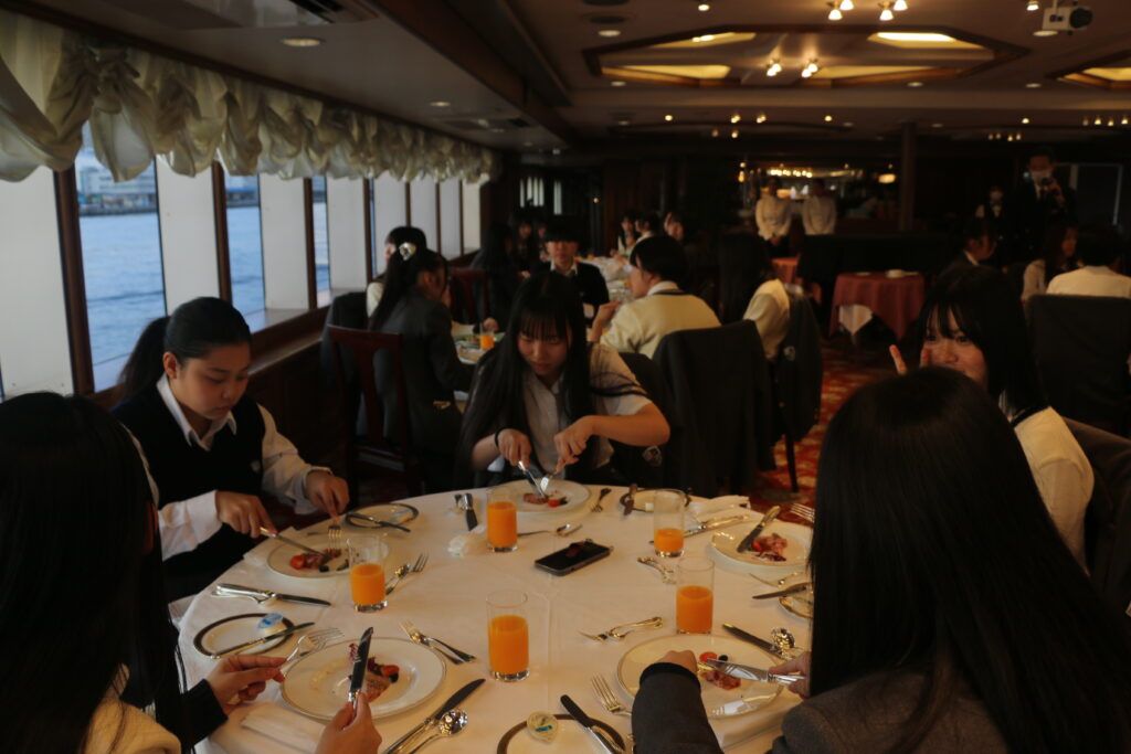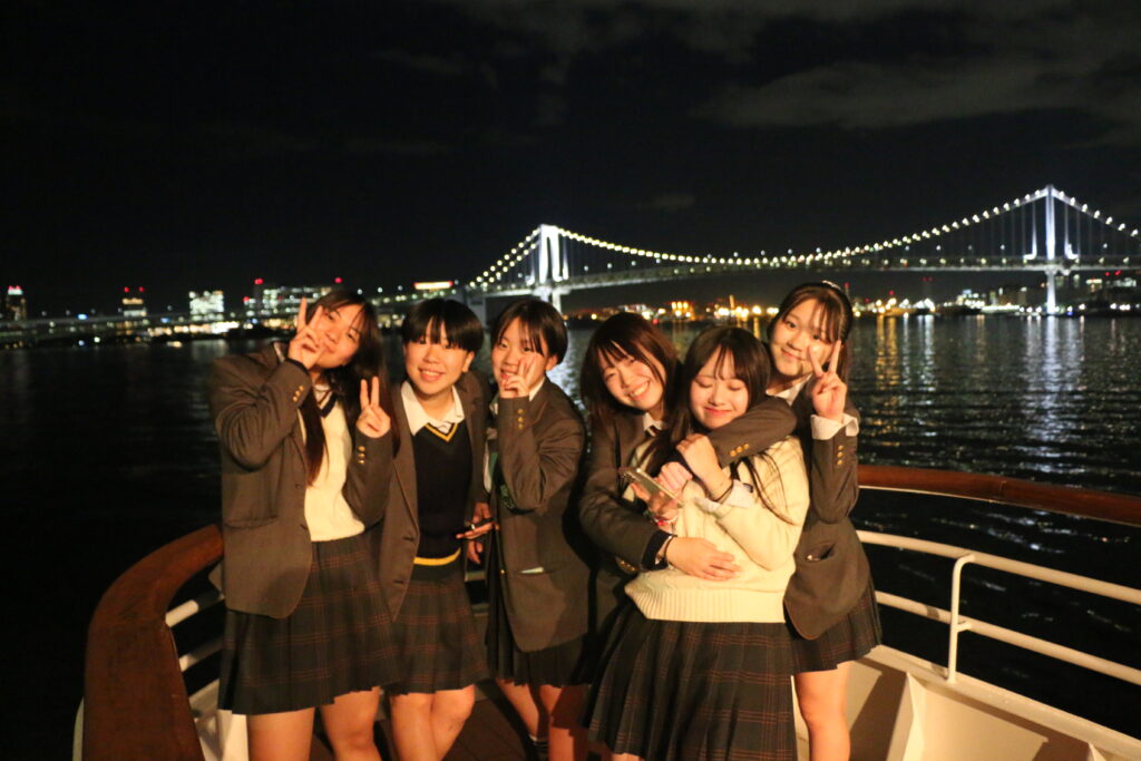そして夜は、待ちに待ったクルーズディナー!東京湾をゆったりと進む船上から眺める夜景は、まさに息をのむ美しさ。レインボーブリッジや東京タワーなど、きらめく景色を背景に友人たちと笑顔で語り合う時間は、この修学旅行の中でも忘れられない思い出になりました。