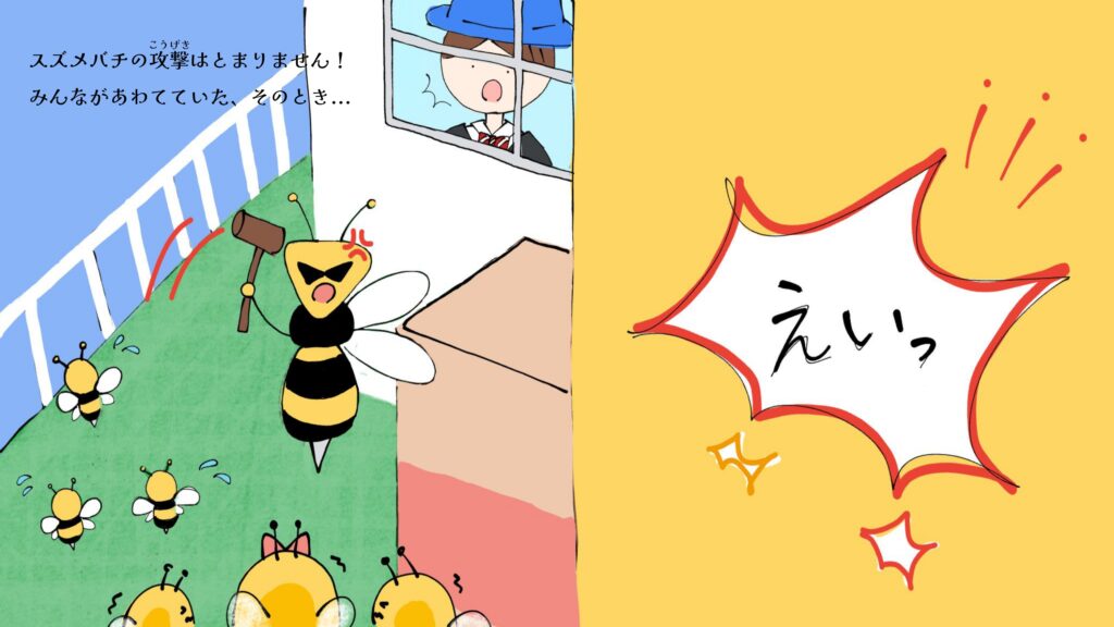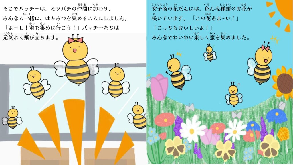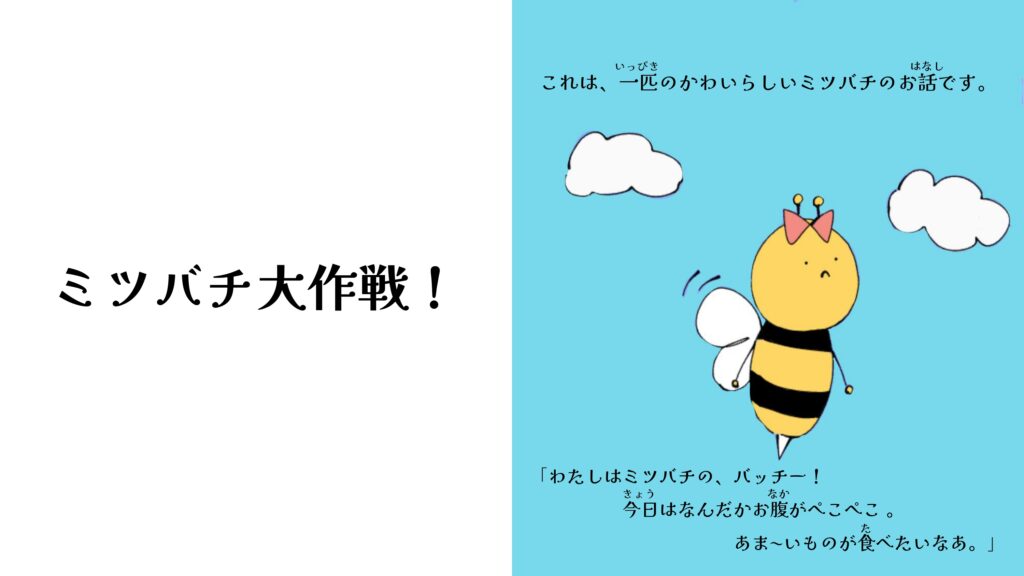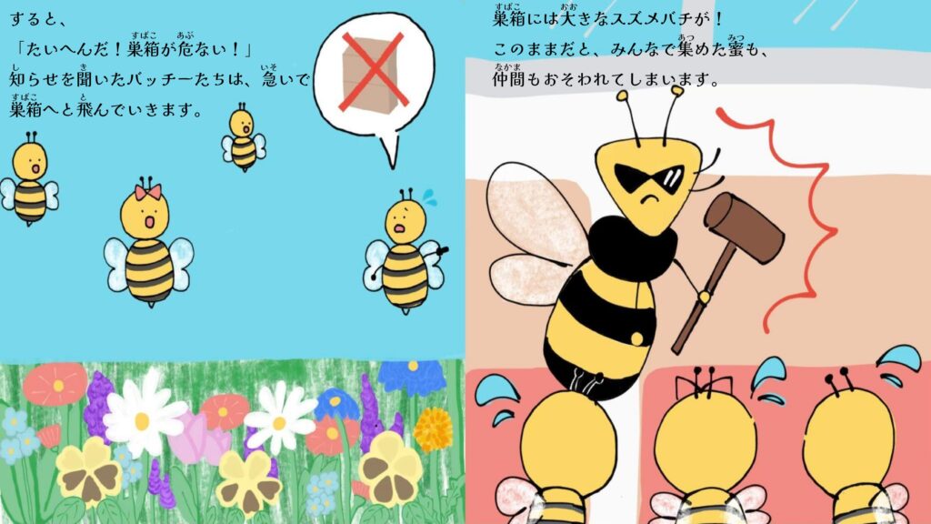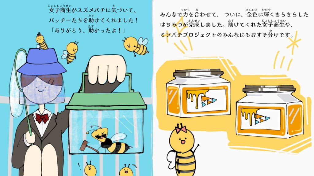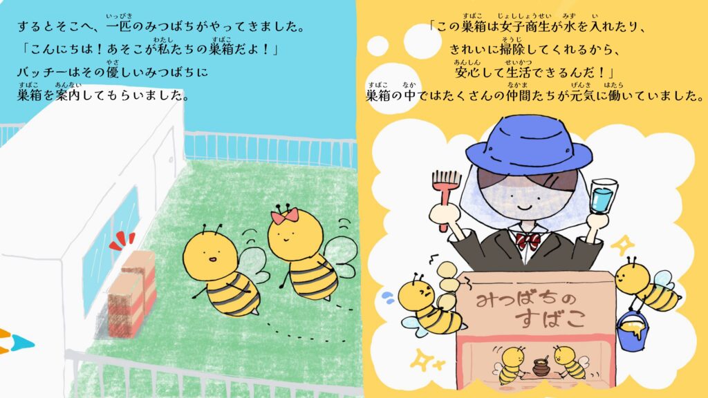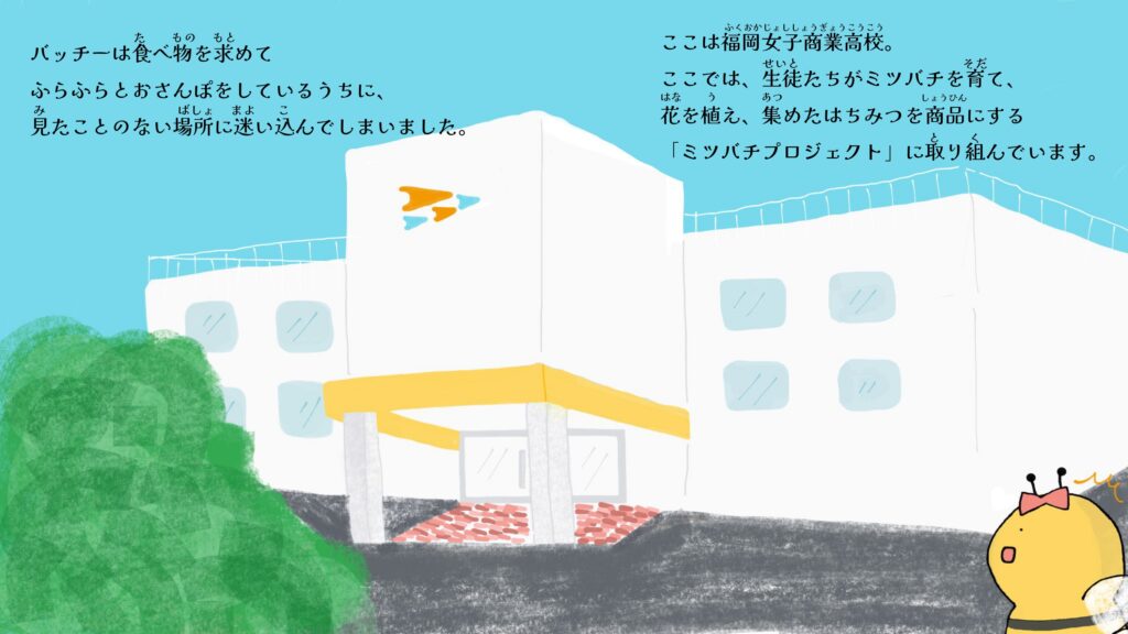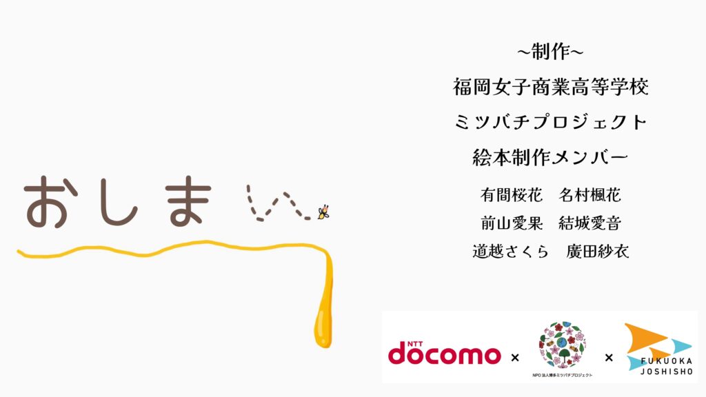 本校ミツバチプロジェクトでは、株式会社NTTドコモ様・NPO法人博多ミツバチプロジェクト様のご協力のもと、ミツバチをテーマにした絵本『ミツバチ大作戦!』を制作しました。