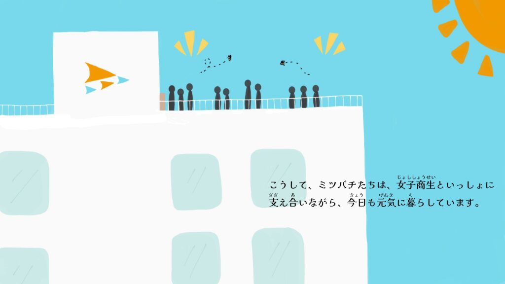 主人公のミツバチ「バッチー」が福岡女子商業高校に迷い込み、仲間たちと一緒にはちみつを集めながら、女子商生との絆を深めていく物語です。ミツバチと人間が互いに支え合う姿を通して、自然との共生というメッセージを込めています。