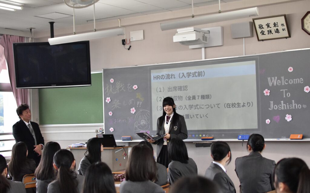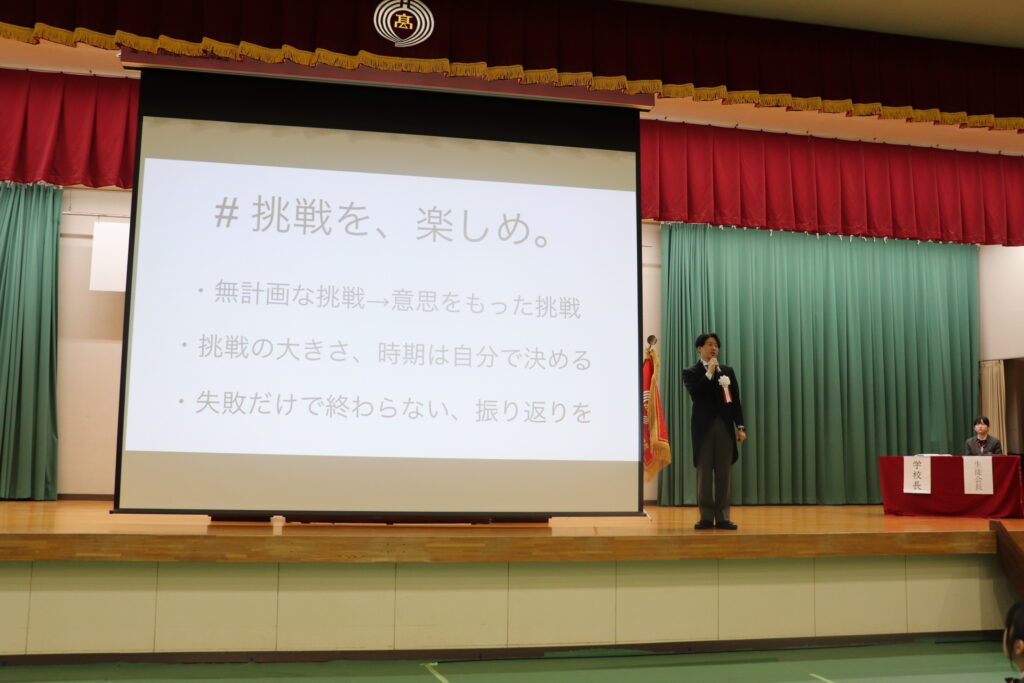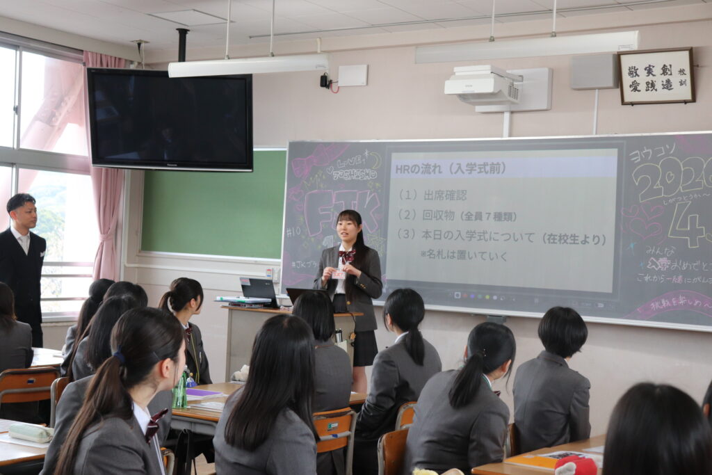式では、緒方校長による式辞や在校生代表による歓迎の挨拶に加え、生徒同士の対話の場も設けられました。また、司会進行や来賓紹介、新入生の入退場の誘導など、式の運営は在校生が中心となって担い、新入生が安心して過ごせるような新たな企画が実施されました。さらに在校生からは、これからの学校生活を送るうえでの心構えがプレゼンテーション形式で伝えられました。